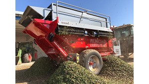 campo, almacén o sitio designado. Las despellejadoras colocadas horizontalmente en las esquinas del remolque, trabajan independientemente unas de otras, junto con los sinfines accionados por motores hidráulico hace que se obtenga