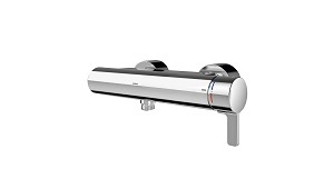 tope de temperatura ajustable y con protección antigiro con válvula de retención y filtros. Para la conexión al agua caliente y fría. Versión totalmente metálica, en latón cromado y pulido
