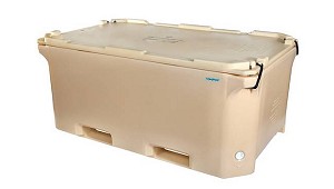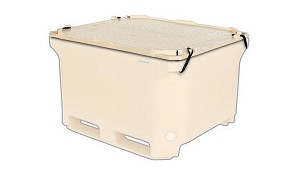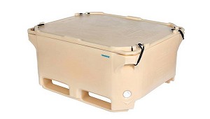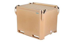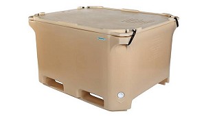 pared de PE relleno de PUR y una gran capacidad isotérmica. El contenedor 1400 es apto para transpaletas y carretillas elevadoras. Peso 120 kg. Volumen 1.280 litros. (Contenedores de plástico)