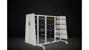 Tronzadoras MG, S.A.: - Carro horizontal porta perfiles para la colocación a pie de máquina y traslado en el taller. - Apoyos recubiertos de goma para evitar ralladuras. - 5 niveles con 4 brazos