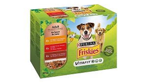 Comida húmeda para perros adultos con pollo, cordero y buey en salsa Purina Friskies - Nestlé España, S.A.: - Alimento completo para perros adultos con Pollo y Zanahorias. - Alimento completo para perros