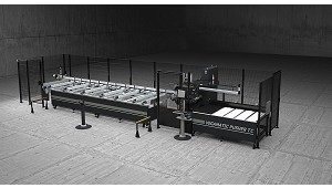 corte de los perfiles por brazo robótico de alto rendimiento. Ángulos de corte entre 45°-135°. Códigos de barras en los perfiles mecanizados para ensamblaje. (Centros de corte y mecanizado para aluminio)