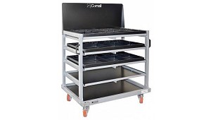 técnicas: - 3 cajones extraíbles con cubetas termoformadas. - 2 estantes fijos. - Atril. - 4 ruedas diámetro Ø 125 mm (2 con bloqueo). (Bancos de trabajo y de herrajes para carpintería de aluminio)