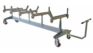 Carro desbobinador para burletes Caracteristicas técnicas: - Dos portabobinas. - 3 ruedas diámetro Ø 80 mm (2 con bloqueo). - Embalaje en cartón. (Bancos de trabajo y de herrajes para carpintería de aluminio)