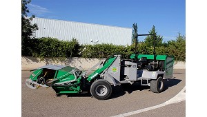 Velocidad del cepillo regulable. - La dureza del cepillo se adecua al producto. - Máquina articulada para fincas intensivas. - Tracción a las cuatro ruedas. (Barredoras y recogedoras de aceitunas y frutos secos)