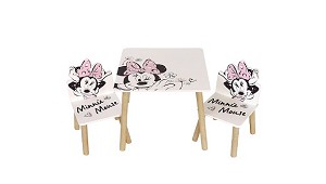 Mouse. Medidas: mesa 50 x 50 x 44 cms y sillas 27 x 27 x 52 cms. Materiales: DM pintado + calca. Presentación: en caja color. (Otras manualidades y packs creativos)