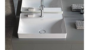 encimera es rectangular y trabajado de forma extremadamente precisa. Duravit concede mucha importancia a las líneas de los bordes paralelos y extremadamente finos con un grosor de solo 5 mm. El suave