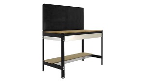 encimera resistente que soporta una carga de hasta 600 kg y un estante inferior que resiste 75 kg. Además, incluye un panel de herramientas perforado y un amplio cajón fabricado