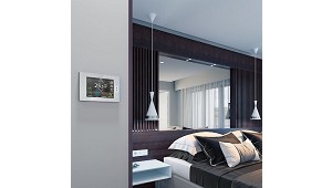 menú de navegación. El salvapantallas con hora, fecha y/o temperatura aparece cuando la pantalla táctil no se está utilizando y desaparece automáticamente para mostrar los controles cuando el usuario se acerca