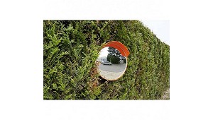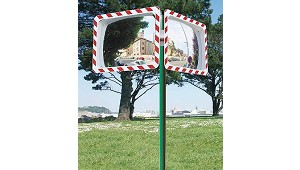 Odiseo, S.L.: Fabricado en policarbonato con bandas reflejantes rojas. Espejo convexo antirotura. Para la utilización en vías públicas, parking interiores o exteriores, cruces de visibilidad reducida, etc. (Espejos de vigilancia)
