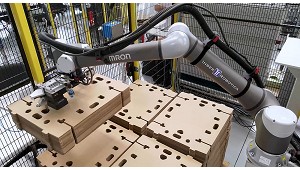 robots colaborativos de Omron. Este sistema exclusivo está diseñado específicamente para colocar de forma fiable una pila de cajas en la cinta transportadora, que sirve como cargador alimentador para el montador