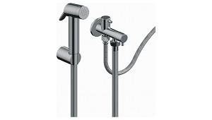 cuerpo cilíndrico. - Soporte abs cromado. - Llave de escuadra latón cromado con dos salidas. - Florón acero inox 50. - Flexible PVC gris metalizado con tuercas de latón cromadas. (Otros equipamientos para baños)