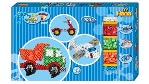 avión (nr. 8216) y camión (nr.8217) *2 soportes de pie *3 Diseños impresos a color (Comprueba la imagen del artículo) *Papel de planchado Hama *Instrucciones de planchado (Otras manualidades y packs creativos)