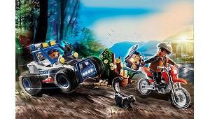 hueco. El set contiene dos figuras de PLAYMOBIL, una moto, un coche todoterreno de la policía, un árbol hueco, monedas de oro, pistolas y muchos otros extras. (Set y kits de construcción)