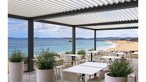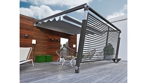 motorizado y la posibilidad de incorporar un cierre lateral. Dicha pergotenda es de fácil limpieza y mantenimiento, utiliza tejidos técnicos y facilita el ahorro energético. (Pérgolas, cenadores y toldos planos)