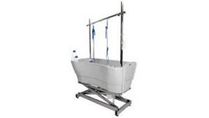 Especial perros pequeños y medianos - Puerta lateral acceso - Dimensiones exteriores: L 135 x I 73 x d 50 cm - Se sirve con horca (Bañeras para peluquería canina y felina)