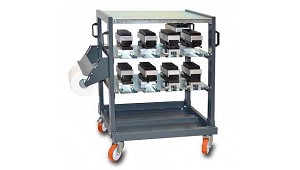 ruedas Ø 125, 2 de las cuales con sistema de bloqueo. - n.16 compartimentos para herrajes perimetrales, 3 de los cuales modulares. - n.14 compartimentos para angulares. (Bancos de trabajo y de herrajes para carpintería de aluminio)