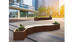 Banco De acero y madera Pagoda - Representaciones Martín Mena, S.L.: El banco Pagoda es un asiento sencillo y duradero, apto para muchos tipos de espacios; plazas, patios, parques, jardines, zonas