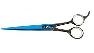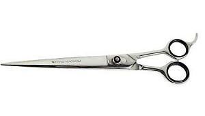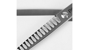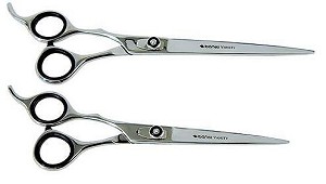 Diámetro de los agujeros para los dedos: 2 cm (asimétricos). Incluye protectores. · Acabado en acero brillante. · Peso: 77 g. (Tijeras de corte y de dientes para peluquería canina y felina)