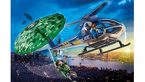 flota suavemente mientras cae. El helicóptero de policía retoma la persecución. Operación policial de gran envergadura. El ladrón quiere escapar con paracaídas. Mientras el ladrón se desliza lentamente hacia el suelo