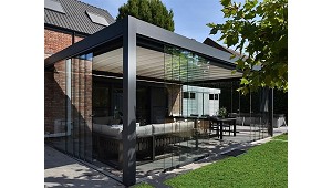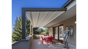 permite utilizar el espacio todo el año, ya que brinda posibilidades de cerramiento total o parcial y calefacción. Es resistente al viento y la lluvia. (Pérgolas, cenadores y toldos planos)