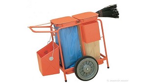 servicios de limpieza de ayuntamientos y colectividades Dimensiones 96x58x93 cm Materiales Estructura de acero cincado y pintado epoxi. Cubos de plástico. Colores Color estándar: naranja. Consultar otros colores. (Carros de limpieza)