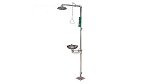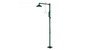 Maneta de activación ubicada a la altura del usuario. Válvula de caudal de agua de paso total con apertura automática, instantánea y cierre manual. El lavaojos con soporte a ducha