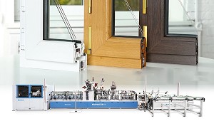 Recubrimiento de perfiles de PVC y aluminio con una recubridora, para el encolado de folios de papel o PVC con adhesivo termofusible PUR sobre perfiles de PVC y aluminio. Especialmente