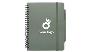 papel rayado color crema de 70 g/m² certificado FSC. Incluyen un bolígrafo de tinta negra. • Colores: azul marino, negro y verde • Material: Plástico reciclado oceánico • Medidas: 21 x 14.5 cm • Peso