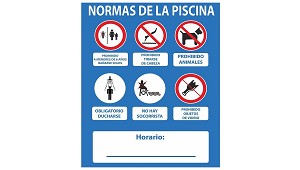 Campo, S.A.que ya está desactivado.: Cartel informativo de "Normas de la piscina" cuando no hay socorrista disponible. Con espacio para apuntar el horario de apertura. Fabricado en PVC. Medida: 500x400