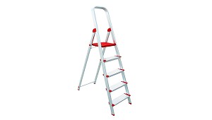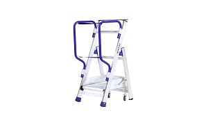 escalera de uso doméstico equipada con peldaños estriados antideslizantes de 12 cm de profundidad. Se trata de una escalera con plataforma amplia y guardacuerpos pensada para trabajos en almacén. Es una escalera