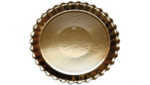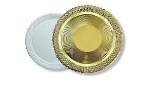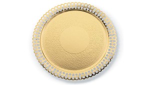 presentaciones de pastelería, hostelería y catering. Es muy resistente y elegante. Se fabrica en oro y diferentes medidas: 23, 26, 29,31,33 cm de diámetro. (Vajillas desechables / platos desechables)