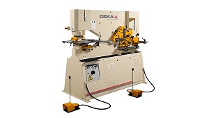 lámpara halógena. Versión S: - Máquinas accionadas por dos cilindros. - 5 puestos de trabajo, equipados con utillajes para corte de L, barras ø y, entallado rectangular y punzonado. - Cambio rápido de punzón