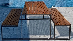 bancas. La mesa picnic «Málaga» (puede suministrarse mesa y bancas por separado, de forma independiente) está disponible en dos versiones: madera y Reciplast-plástico reciclado (no requiere mantenimiento). Versión especialmente