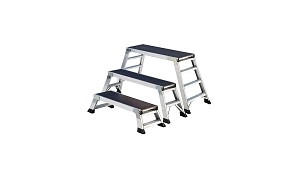 bisagras con un perno de seguridad patentado que bloquea las patas en posición abierta o cerrada. Al plegarse, la plataforma ocupa muy poco espacio y es muy sencilla de transportar