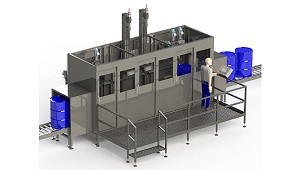 producción con alta capacidad de llenado. También puede incluir el tapado, el destapado y el sellado automáticos de los bidones. - Capacidad: 120 - 250 L - Producción: hasta 130 contenedores/hora - Entrega: bajo