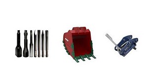 hincado de postes, hincador de malla metálica, punta de pretaladrado, compactadora estrecha simple, compactadora estrecha doble, rueda compactadora HD, rueda doble compactadora, cortadora de asfalto, grapa para tablaestacas. También disponible