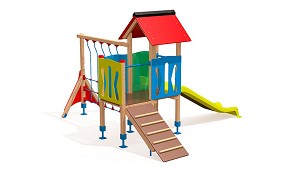 infantil gracias a sus colores vivos y a la variedad de movimientos que ofrece. Material: estructura de madera (pino soriano de bosques gestionados sosteniblemente), paneles de HDPE. - Dimensión: 3,33 x 3,64 x 2,42 m. - Superficie