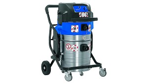 polvos, sólidos y líquidos. El aspirador está montado sobre un robusto bastidor de acero barnizado, con soporte para accesorios, dotado de ruedas antihuellas, 2 fijas y 2 giratorias con freno. Contenedor de residuos en acero con ruedas. Modelo fabricado según normas de seguridad para la utilización en áreas con riesgo de explosión, para polvos explosivos