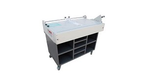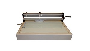 tapas. Topes laterales. Superficie del tablero con succión de aire. Luz interior. Accesorio de corte incluido. Voltaje 220 V. Mesa soporte opcional. Accionamiento manual (maneta). Superficie útil del tablero 530 x 420 mm. (Encuadernadoras