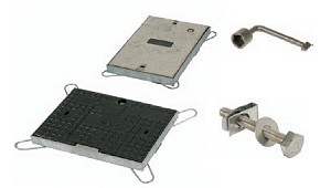 tapas de arquetas VB excepto VB708B y VB-6RND. 71P51186: llave de vaso para tornillo pentagonal y elevador de tapas (2 en 1). VB-STD-CR : tapa de hormigón y marco
