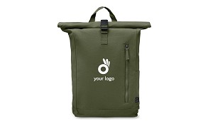 top - Moloon - Ribel Ideas, S.L.: Mochilas personalizadas con cierre roll top autoadherente. Están fabricadas en algodón reciclado 390 gr/m² y poliéster reciclado. • Colores: negro, caqui, beige, verde y azul • Materiales